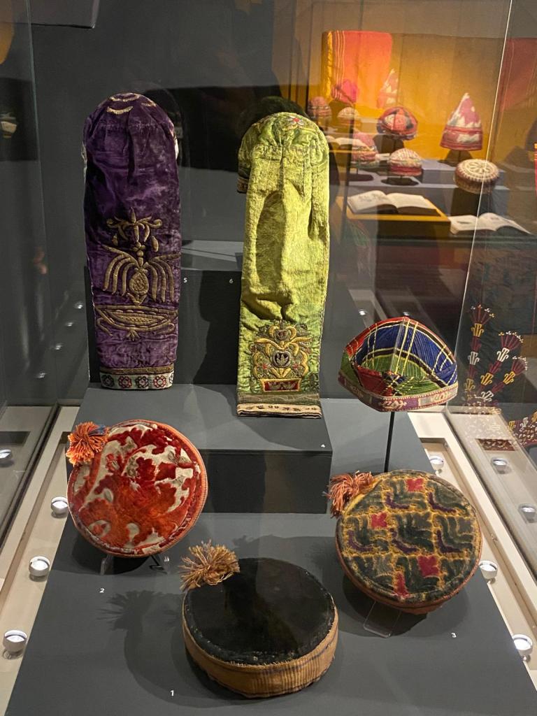 The paranja was usually made from banoras, a handmade fabric with a gray, green, or blue silk warp and a cotton weft, with thin black stripes. The exhibited garment is embellished with embroidery and trimmings, fine details such as bone or mother-of-pearl buttons, tassels with beads, and metallic sequins. The marvel extends to the hats. The displayed examples mostly come from Bukhara, an important center for the art of zardozi embroidery (from Persian zar, meaning “gold,” and dozi, meaning “sewing”). We know that only men executed these embroideries because it was believed that women’s breath could dull the gold. The combination of colors is superb.
