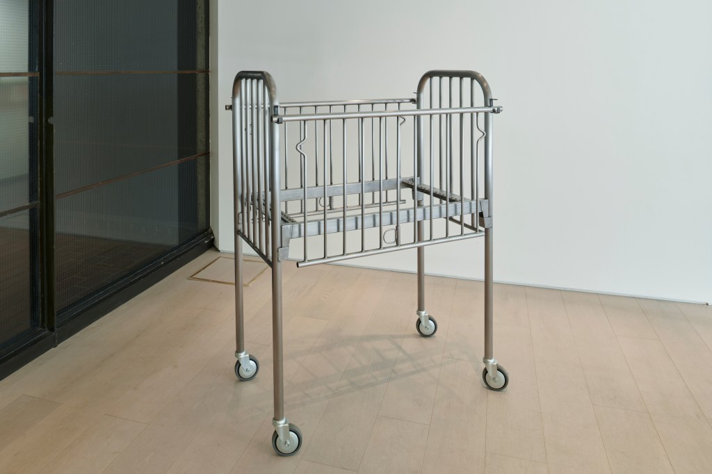 Beyond the large windows of the Barbican, Level 2, the dialogue between the two artists opens up. Having to walk a stretch of road alone, there’s no time to pull together a reasonable explanation, rather an imbalance that pushes my thoughts. I emerge from the lethargy, as yet not heard. I find myself in an emptiness, a silence, though not only mine. In a glass case, the alchemy of small, handmade objects bursts forth. Obstinate. They seem to have lost their way. Further on, an iron-barred crib (Incommunicado, 1993) ceases to reassure. Lying on the floor, next to Giacometti’s “Woman with her throat cut”, “A bigger splash”, red Murano glass coronets, falling to the floor as if slow boiling, evoke the presence of a violated body.